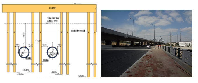 6)東大通河橋(國(guó)道312橋臺(tái)基礎(chǔ)),區(qū)間在CK17+060~CK17~130范圍內(nèi)側(cè)穿橋樁基,橋樁基樁徑1.2m,隧道與樁基最小水平凈距約1.5m,與聯(lián)絡(luò)通道很接近,最近的樁基位于聯(lián)絡(luò)通道結(jié)構(gòu)北側(cè)約3.3m,為非常接近關(guān)系,并且是隧道雙線與3排樁基平行穿越形式。
