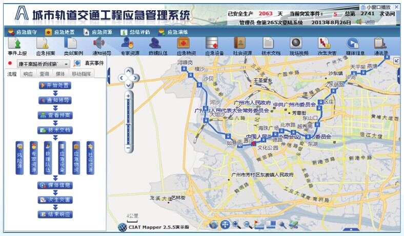 城市軌道交通工程大多為地下工程,穿越城市中心區(qū),地質(zhì)與環(huán)境條件十分復(fù)雜,施工安全風(fēng)險大,建設(shè)工程事故時有發(fā)生。應(yīng)急管理系統(tǒng)是一個以城市軌道交通工程事故為管理對象,以應(yīng)急工作的事前一事中一事后全過程管理為主線,具有應(yīng)急值守、數(shù)字預(yù)案、應(yīng)急資源管理、應(yīng)急處置、評估總結(jié)與培訓(xùn)演練等功能的系統(tǒng)產(chǎn)品。通過本產(chǎn)品的應(yīng)用,能夠開展對參建單位應(yīng)急預(yù)案、應(yīng)急物資、應(yīng)急裝備、應(yīng)急隊伍、社會資源、專家資源的日常更新管理,對事故應(yīng)急處置的輔助決策,以及事故預(yù)防的培訓(xùn)與模擬演練工作,從而規(guī)范與提高城市交通工程建設(shè)的應(yīng)急管理水平,建立協(xié)同參建各方開展應(yīng)急管理工作的信息平臺,能夠有效地提高突發(fā)事件的應(yīng)急預(yù)防與處置能力,減小事故損失與次生災(zāi)害。
