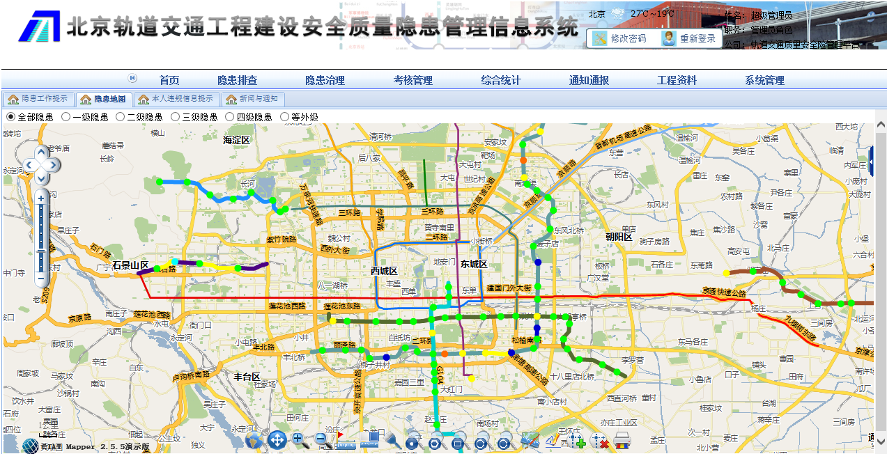 該系統(tǒng)包括隱患工作提示、隱患排查、隱患治理、考核管理、綜合統(tǒng)計、考核評分、工程報告、通知通報等功能,事先對城市軌道交通工程建設(shè)安全質(zhì)量隱患的有序管理,實現(xiàn)參建各方隱患排查與治理的協(xié)同工作,從而將事故控制在萌芽狀態(tài)。