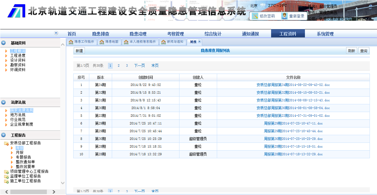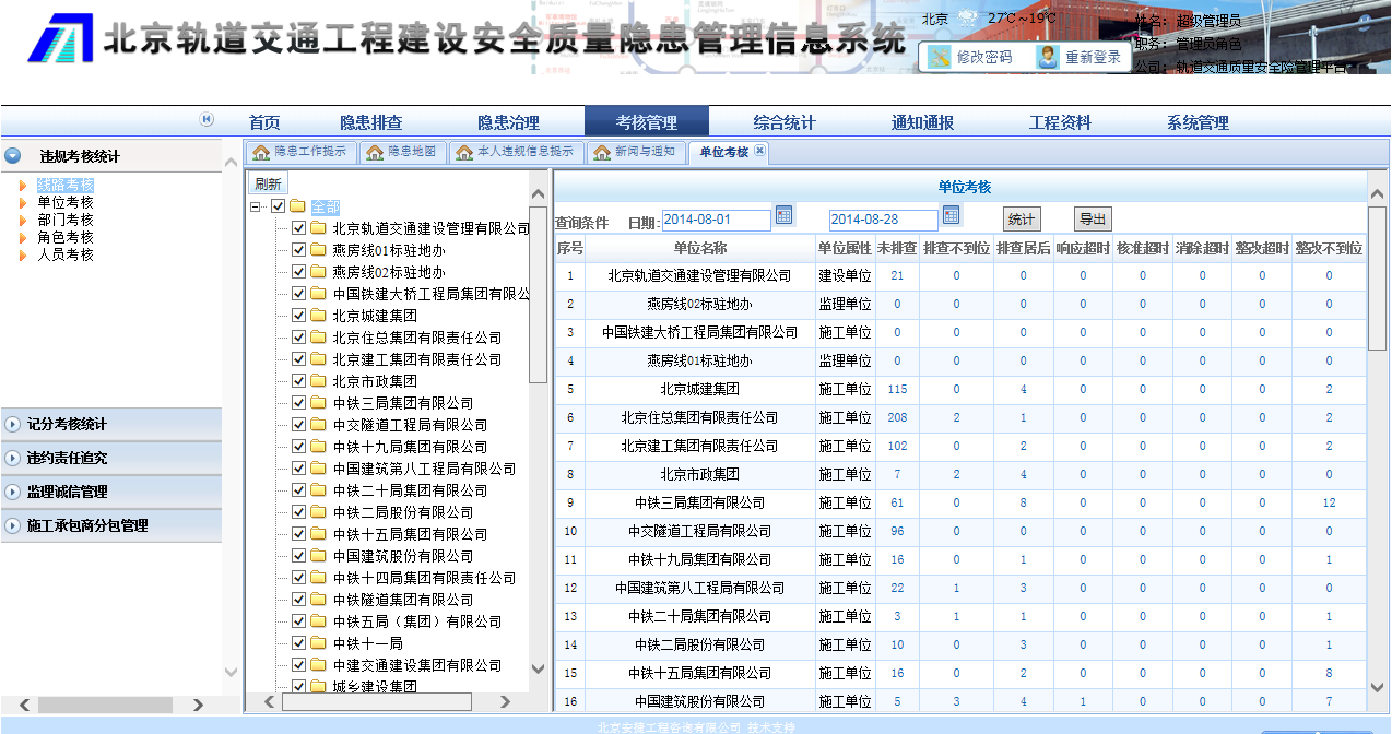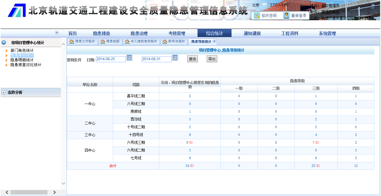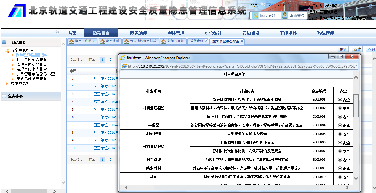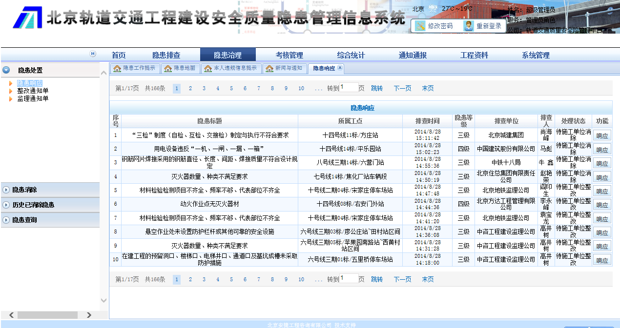 4、完成“北京軌道交通工程建設(shè)安全質(zhì)量隱患管理系統(tǒng)”的需求調(diào)研、升級研發(fā)與測試、使用培訓與數(shù)據(jù)初始化工作;