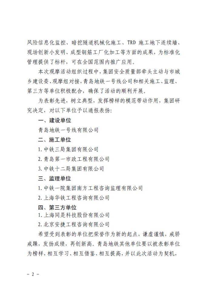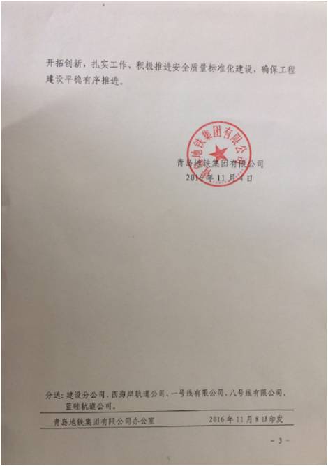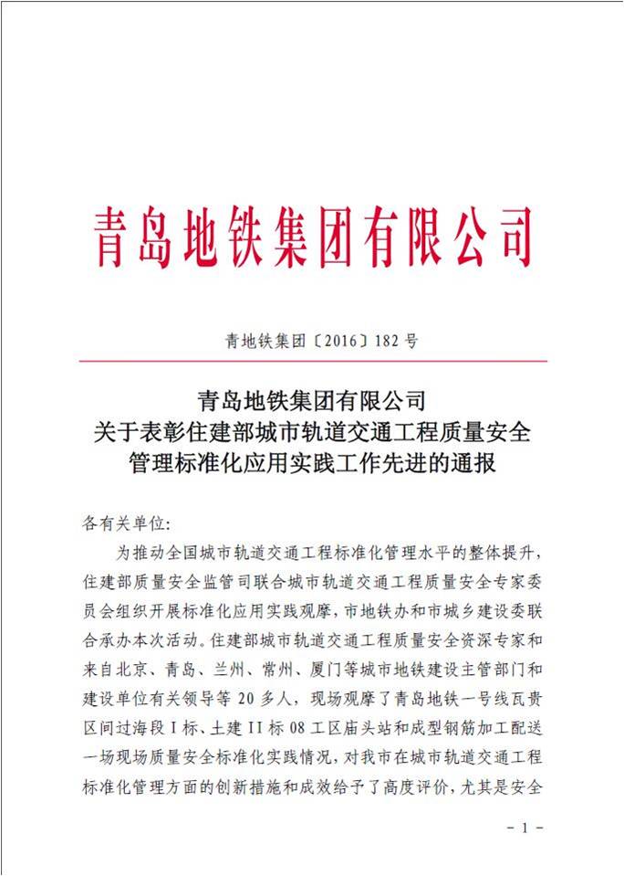 青島地鐵集團(tuán)有限公司對我單位在住建部城市軌道交通工程質(zhì)量安全管理標(biāo)準(zhǔn)化應(yīng)用實(shí)踐觀摩活動中突出表現(xiàn)通報(bào)表揚(yáng)