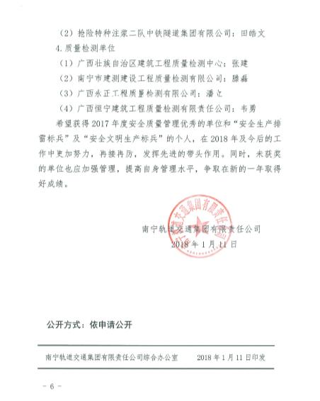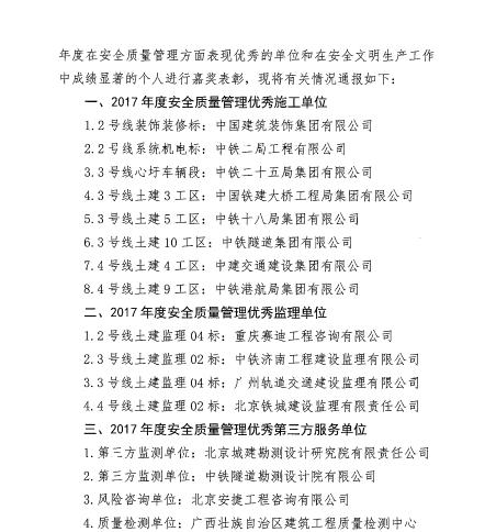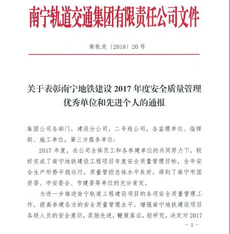 我公司榮獲南寧軌道集團2017年度安全質(zhì)量管理優(yōu)秀第三方服務(wù)單位